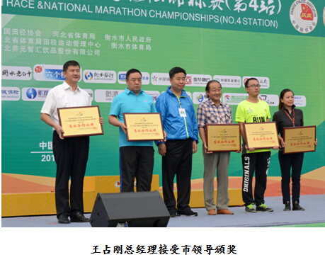 在最后的授牌儀式上,王占剛接受了市領(lǐng)導(dǎo)頒發(fā)的“2016衡水湖國(guó)際馬拉松賽唯一指定用酒”銘牌。