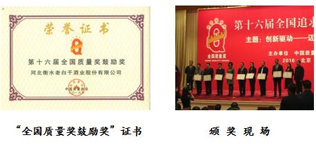 2016年11月10日,公司在中國質(zhì)量協(xié)會組織的第十六屆全國追求卓越大會頒獎儀式上,榮獲第十六屆“全國質(zhì)量獎鼓勵獎”,全國僅有18家企業(yè)獲此獎項。